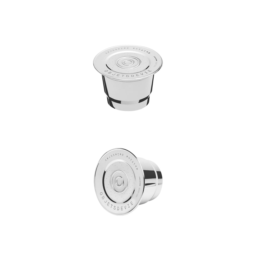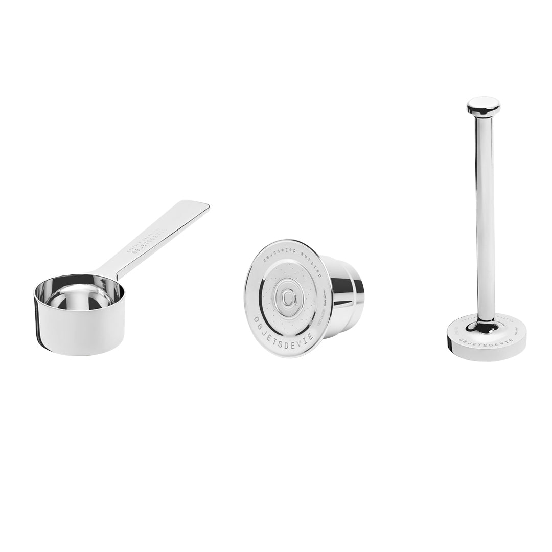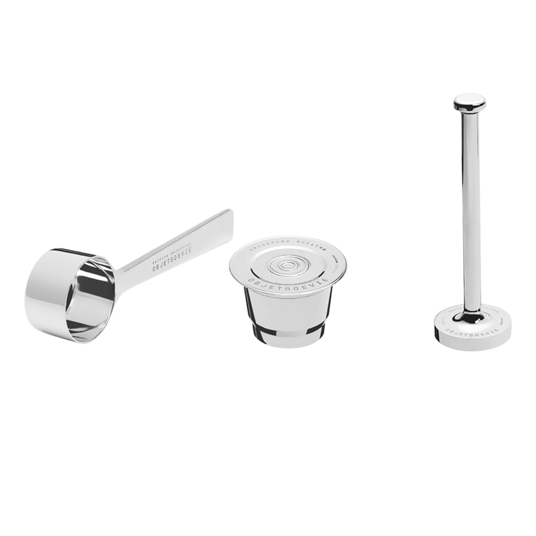 The Moro 925 is an engraved, antibacterial sterling silver set for espresso machine that elevates the concept of recycling. A tribute to the coffee ritual, this set include a measuring spoon, a tamper, and a capsule adapter, each element is designed to enhance the coffee experience with precision and style. Its minimalist design and engraved surfaces make it an exclusive piece, perfect for those who appreciate the art of coffee preparation in every detail.