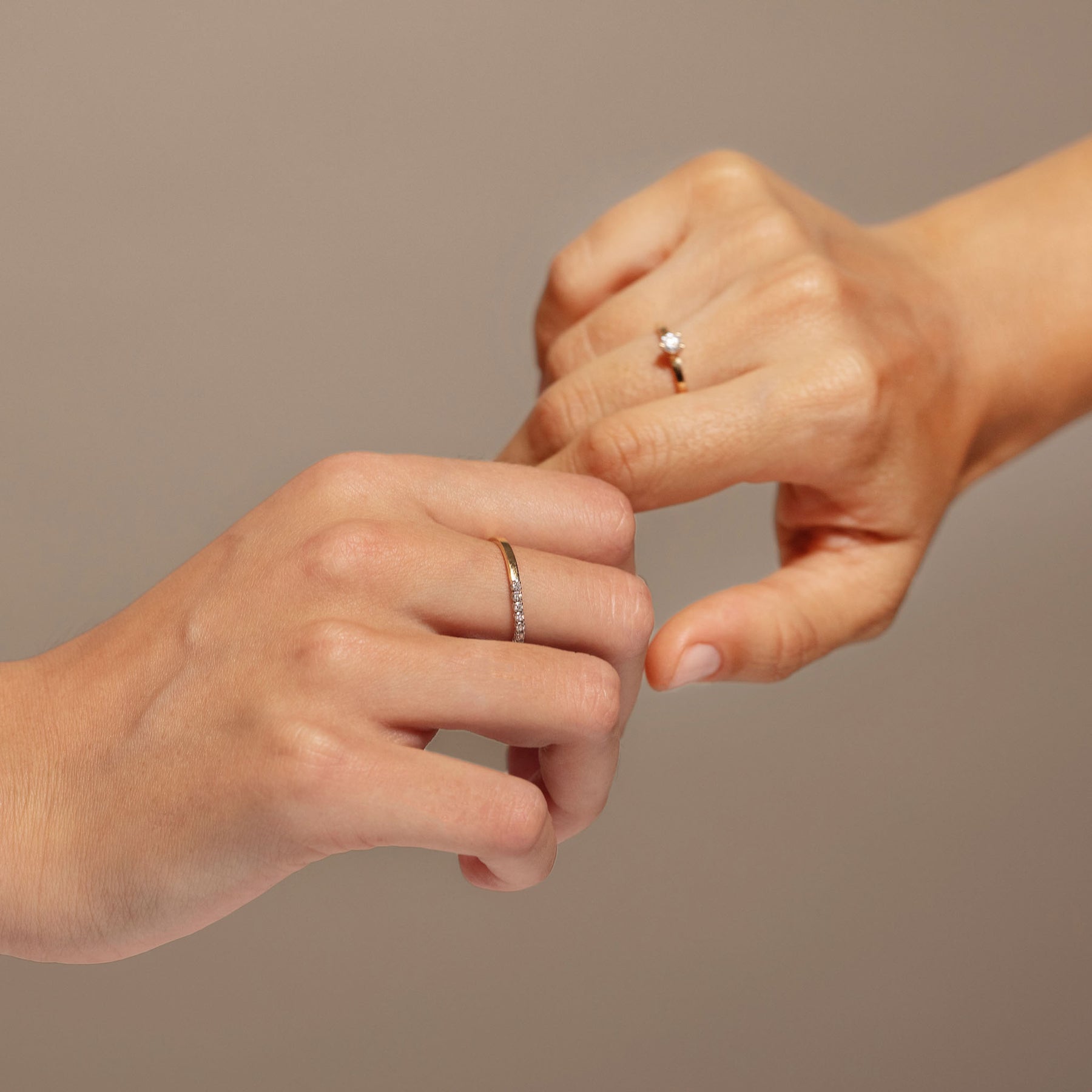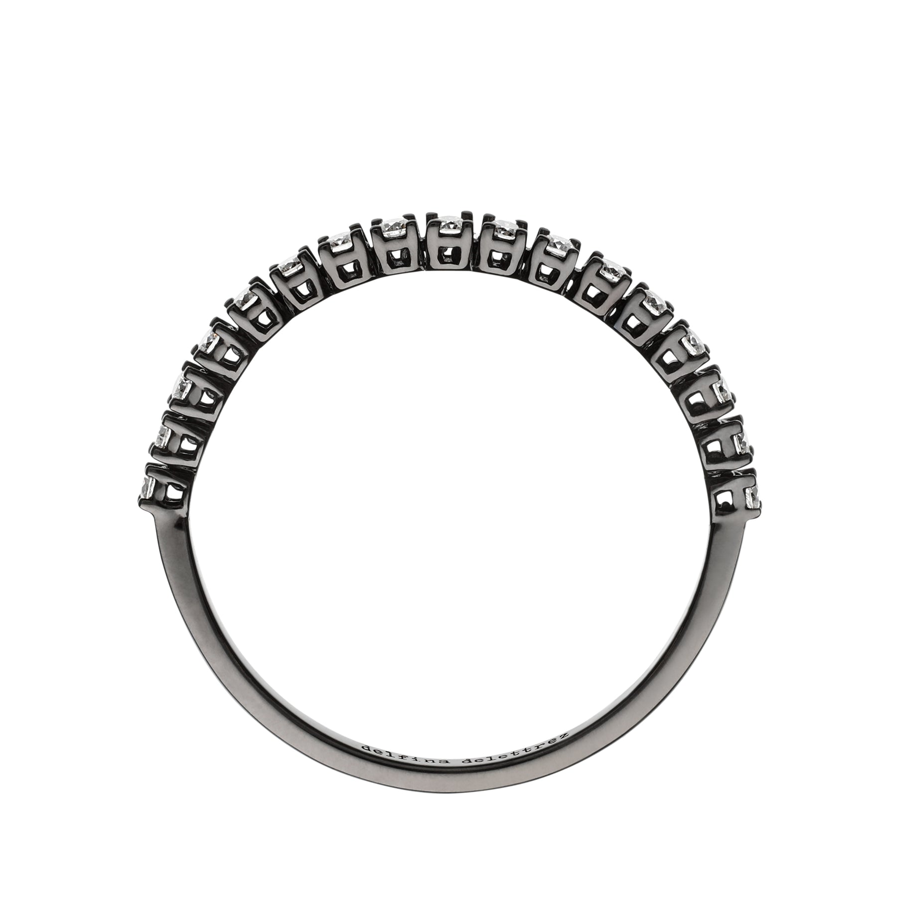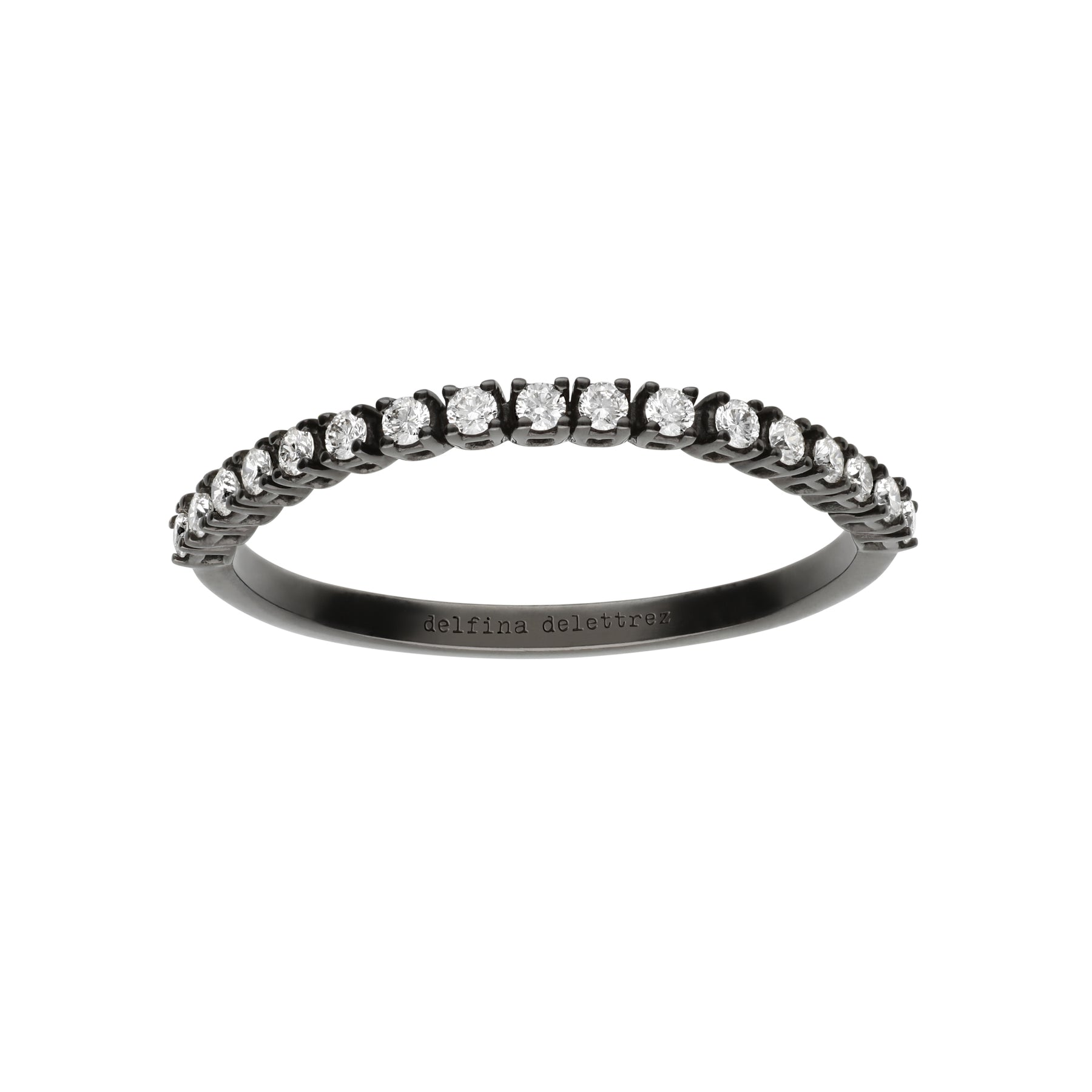 Half solid half liquid-like ring. Rigid gold band meets a soft line of brilliant cut solitaires set in yellow and white gold or rare black ruthenium over 18kt gold.